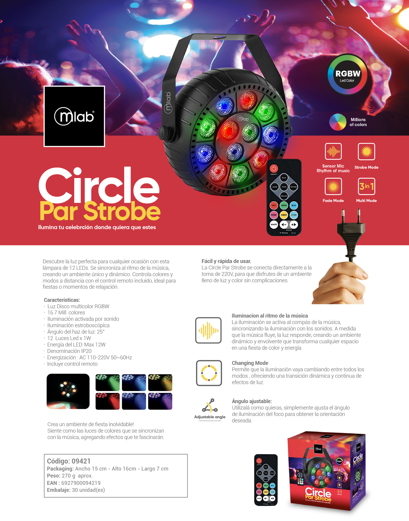 Control Total y Versatilidad: El control remoto incluido te permite manejar todas las funciones a distancia. Puedes cambiar entre diferentes modos de iluminación, incluyendo el modo estroboscópico y el "Changing Mode" que alterna entre todos los efectos de forma continua.