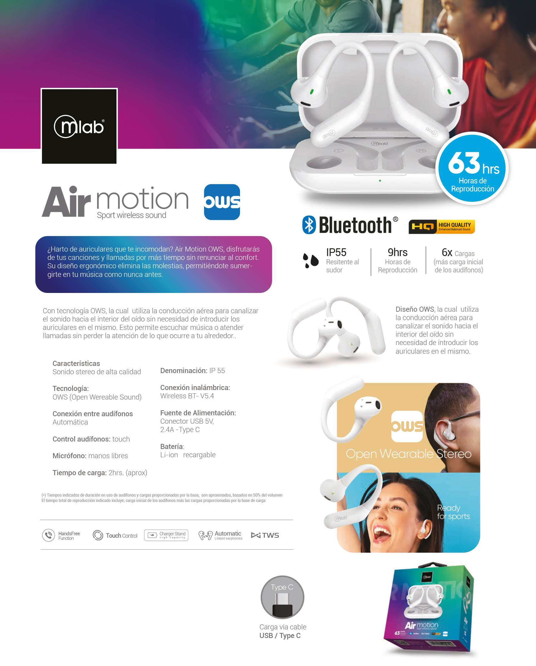 Con tecnología OWS, la cual utiliza la conducción aérea para canalizar el sonido hacia el interior del oído sin necesidad de introducir los auriculares en el mismo. Esto permite escuchar música o atender llamadas sin perder la atención de lo que ocurre a tu alrededor.