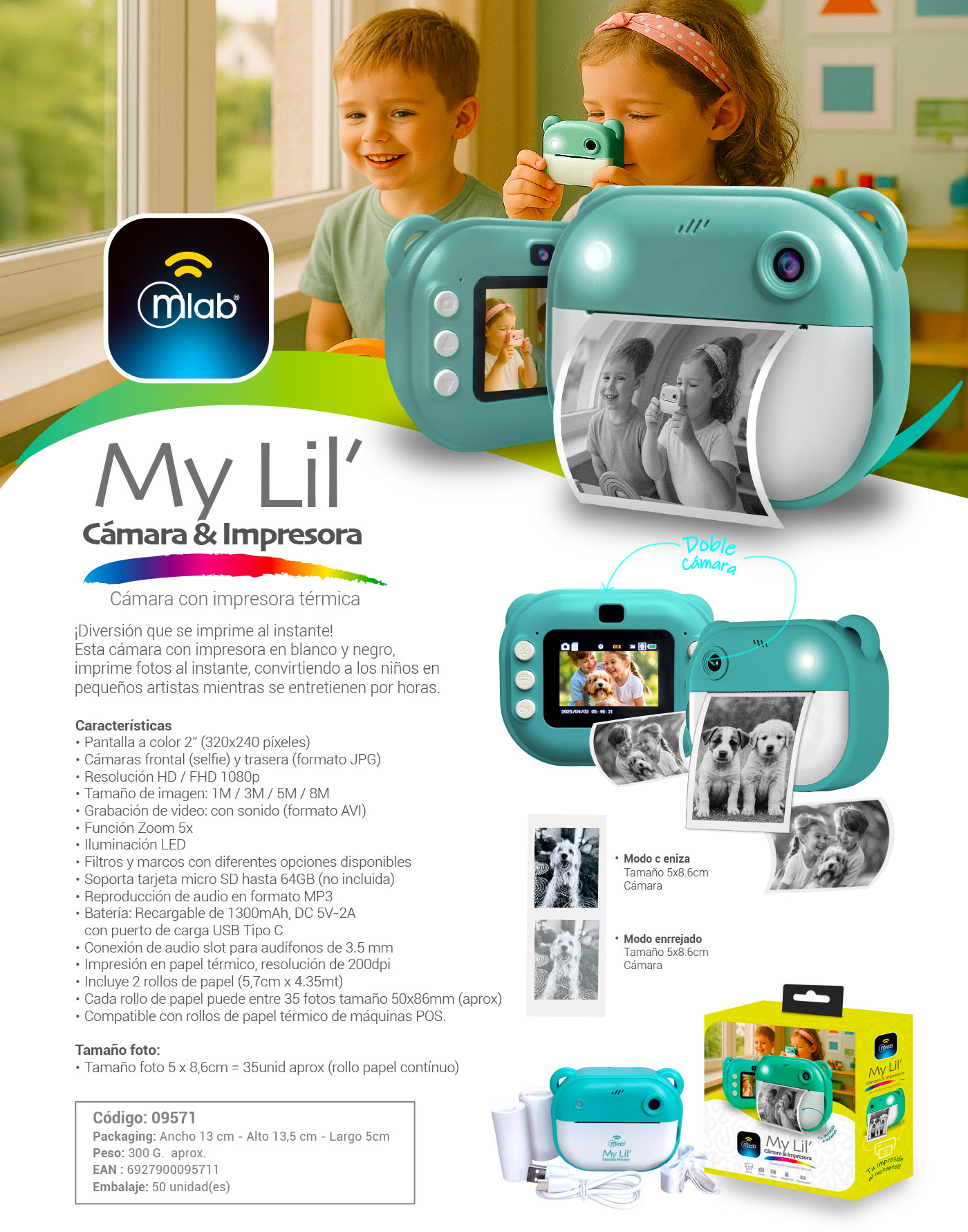 Incluye filtros y marcos para personalizar cada foto, y reproduce música en formato MP3. Su batería recargable de 1300mAh ofrece horas de uso, y se carga fácilmente mediante USB Tipo C.