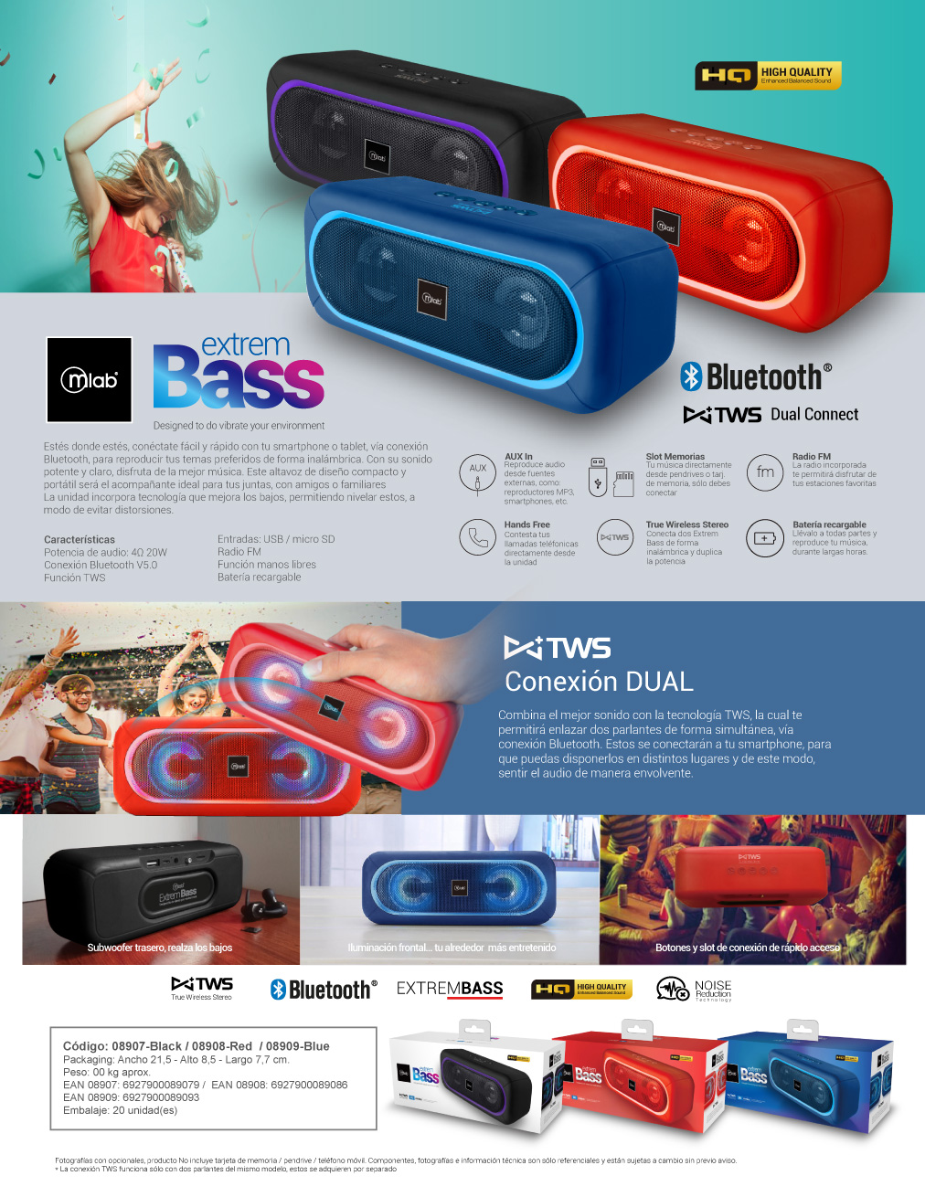 Combina el mejor sonido con la tecnología TWS, la cual te permitirá enlazar dos parlantes de forma simultánea, vía conexión Bluetooth. Estos se conectarán a tu smartphone, para que puedas disponerlos en distintos lugares y de este modo, sentir el audio de manera envolvente.