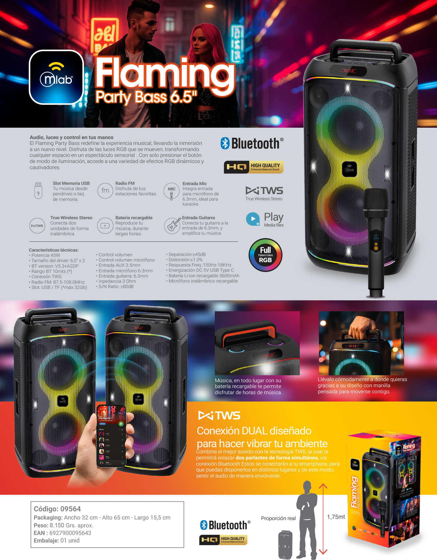 MLAB PARLANTE FLAMING PARTY BASS 6,5" x 2 MIC INALAMB. BLACK 9564