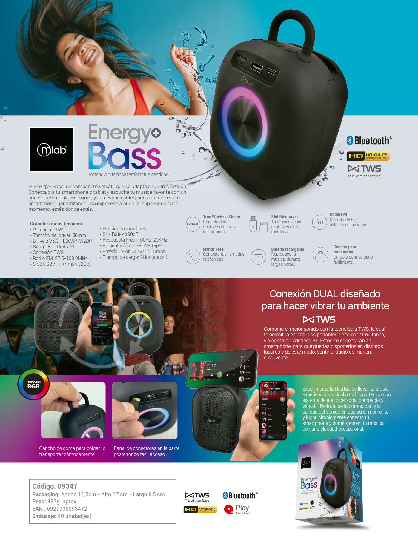 - ___________________________________________________________________________________ El Energy+ Bass: Un compañero versátil que se adapta a tu ritmo de vida. Conéctalo a tu smartphone o tablet y escucha tu música favorita con un sonido potente. Además incluye un espacio integrado para colocar tu smartphone, garantizando una experiencia auditiva superior en cada momento, estés donde estés.