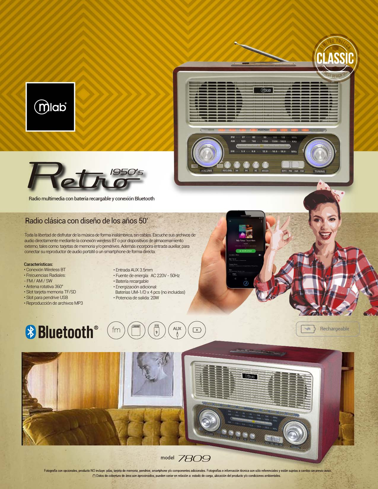 RADIO RETRO RECARGABLE MLAB BT/USB/FM 7809